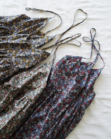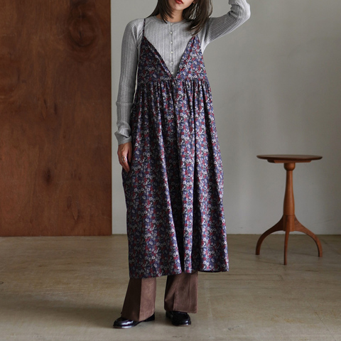 クラシカルな小花柄が映えるキャミワンピース。華奢な肩紐が繊細な印象を添え、フェミニンな雰囲気を演出します。