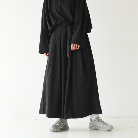 まるでスカートのように揺れるシルエットが印象的なフレアワイドパンツ。