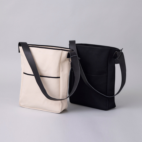 クリーンなコットンキャンバスにブラックのレザーベルトハンドルで全体の印象を引き締めました。