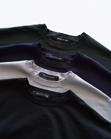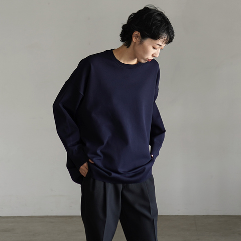 クルーネックのシンプルな首元がすっきりとした印象を与え、前後差のある裾が腰まわりを自然にカバー。程よい落ち感が女性らしい上品さを演出します。