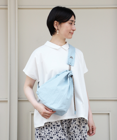 巾着タイプの袋状のバッグにショルダー紐がついた個性的なデザインのバッグです。