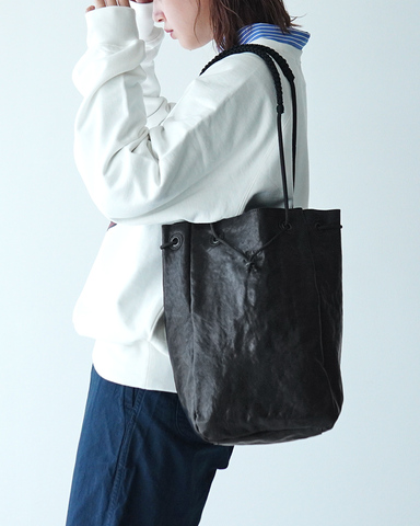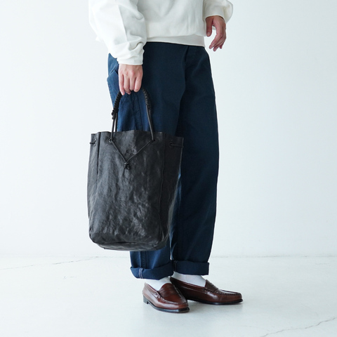 ネイティブカナディアンのカゴを思わせる編み込みディテールを落とし込み、ハンドル部分は漁師の結び方を応用。長さを自在に変えられる仕様で、ショルダーとしてもハンドでも楽しめます。