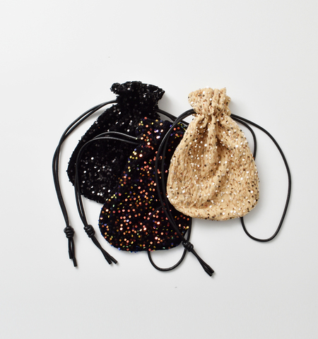 全面にちらばめられたスパンコールの光沢が華やかなBAG。基布は柔らかなベロア素材でくたっとした柔らかみのある表面。エコレザー素材の持ち手紐の調整で手持ちや肩掛けでの使用が可能。紐先端にはブランドロゴの刻印を施したパーツを採用。暗くなりがちなシーズンにコーデのポイントとして取り入れやすさが魅力。おでかけシーンにもすすめのアイテム。