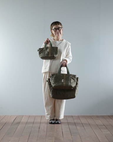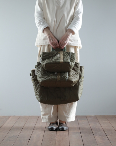 チェコのキルトライナーパンツを材料としてトートBAGをリメイク。裏地に11号帆布を使ってしっかりと形を出したバッグに仕上がっています。キルト特有のふっくらとした可愛らしい雰囲気が魅力のバッグに仕上がりました。もともと付いているテープやダーツを巧みに活かし、目を引く一点に仕上げています。