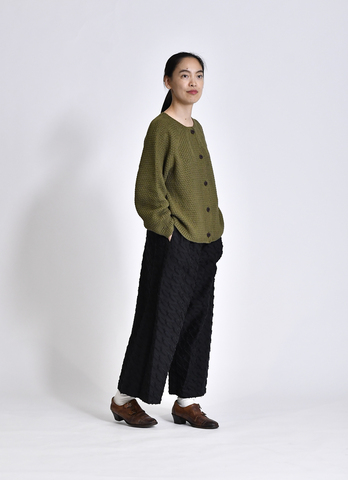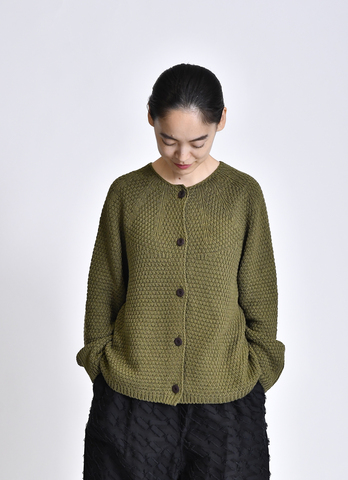 ボタンには、群馬県桐生市の職人がつくる、コットン糸だけでできたボタンを選びました。糸でありながら、しなやかで丈夫。ニットの風合いに、そっと調和します。