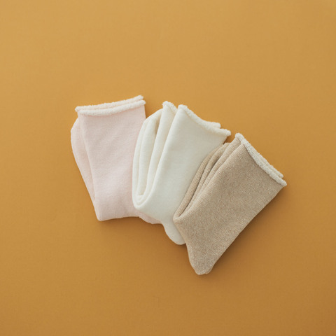 肌にふれる部分はコットン100%の糸でループ状に編み立ててあり、空気をたっぷり含んでいてふかふか。今回、靴下の産地である奈良県・広陵町の靴下工場とのご縁により、三層パイル機を使用したパイル編みの靴下「内側パイルのコットン靴下」がかたちになりました。