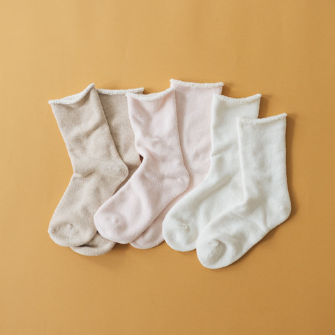 表と内側の糸がコットン、間には伸縮性のある糸を挟んで編んでいるので、夏は涼しく冬はあたたか、空気をたっぷり含んだタオルのような肌触り。面で支えるようなしめつけない履き心地で、足全体がソフトにフィットします。