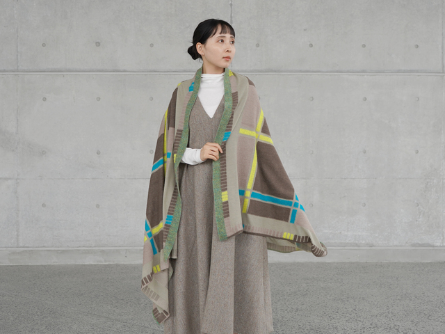 米沢の田園風景から発想した豊かな彩りのストール。様々な大きさのブロックと細いラインのみを使った柄ですが、巻き方によって色々な表情が楽しめます。