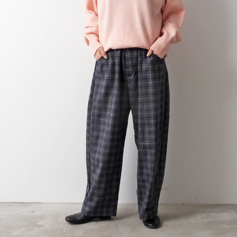 秋冬らしいチェック柄を、上品で軽やかに仕立てた、ウールリサイクルクロスチェック ノッポパンツです。ノッポパンツのゆったりルーズなストレートシルエットで気になる体型もカバーしてくれます。
