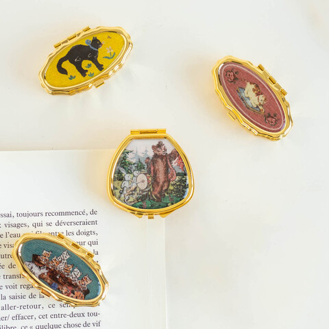 ヴィンテージ缶をモチーフにしたケースは、ミラーが付いたコンパクト仕様。 手のひらにすっぽり収まるサイズ感で、持ち歩きにぴったりです。