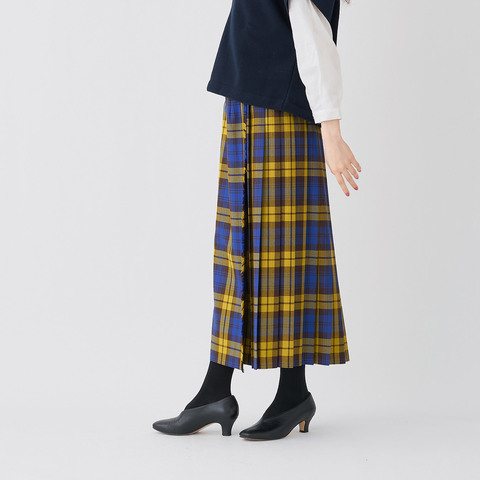 上質な光沢のあるウール素材のタータンチェック生地を贅沢に使用したキルトスカートは、歩くたびにふわり揺れるプリーツとフリンジが表情豊か。