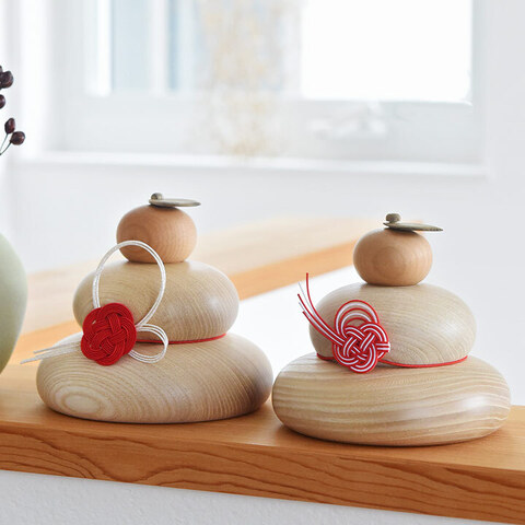 素材は丸太から切り出した、自然な状態の無垢材の「セン材」を使用。白味を帯び、木目の美しいセン材ワックス仕上げにすることで、鏡餅を表現。滑らかで温かみのある質感ながら、木の生命力を感じる美しい木目を楽しめる鏡餅には、厳かな雰囲気も漂います。