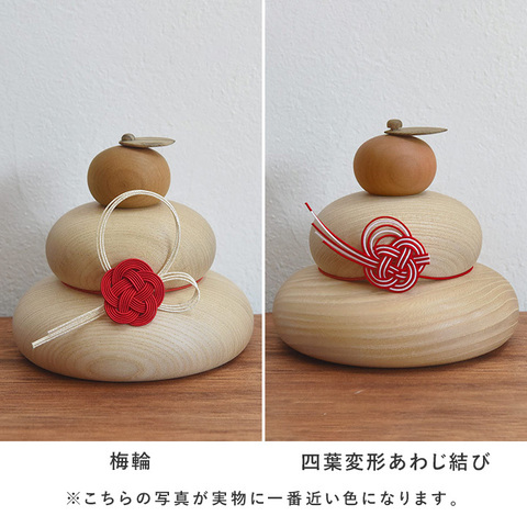 鏡餅本体は、家具にも使用される銘木を加工して制作。餅・橙・葉が天然木本来の色味で表現されています。2025年は水引のデザインが2種類に。縁起が良い梅の花を結ぶ”梅輪”と”紅白梅”からお選びいただけます。ハレの日を飾るに相応しい、おめでたい印象のもので仕上げていただきました。