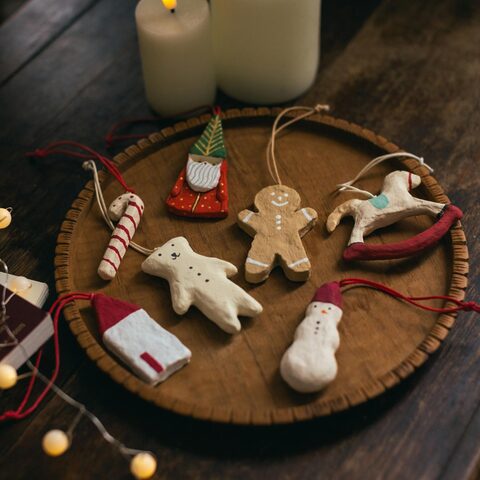 インドのジャイプールで職人が1点ずつ仕上げた、ペーパーマッシュ(紙細工)のオーナメントです。今年はジンジャークッキーと白いクマが仲間入りしました。