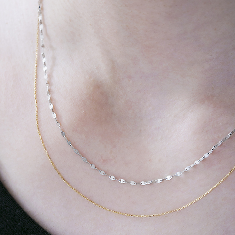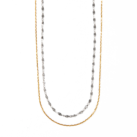 些細な動きでもきらりと上質な輝きを魅せてくれるチェーンと、繊細でシャープな印象のチェーンを重ねたレイヤードネックレスです。