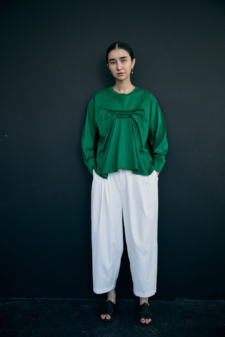 doux bleu定番タックパンツ。伸縮性、接触冷感、透け防止、吸水速乾の備わった機能性素材を使用し、ドライな肌ざわりで春先から汗ばむ季節まで快適に着用可能。2タックデザインで腰周りはゆとりをもたせ、太ももから裾に向けてややテーパードがかかるバランスも◎