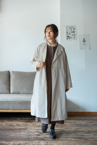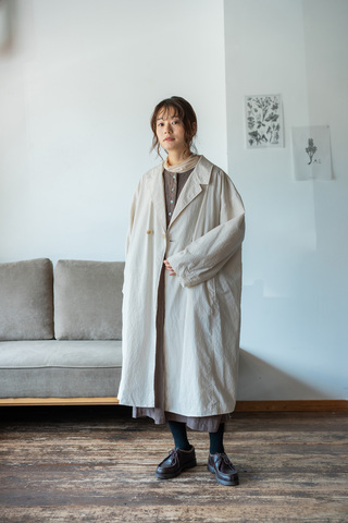 繊細なピンストライプ柄の生地を使用したオーバーコートです。製品染めを施すことで、くったりとした風合いに仕上げ、まるで長年愛用しているかのようなこなれた雰囲気を演出しています。