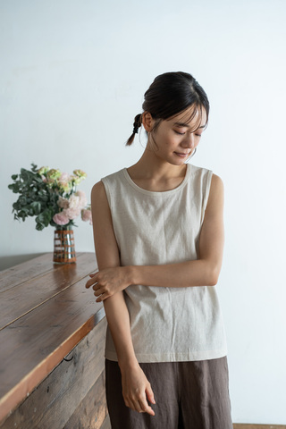 ゆったりとしたノースリーブデザインは、肩まわりを程よくカバーしつつ、涼しげでリラックス感のある着こなしが楽しめます。シンプルだからこそ、デニムやワイドパンツ、スカートなど、さまざまなアイテムと相性抜群。ナチュラルな色味で、コーディネートの幅がぐっと広がります。