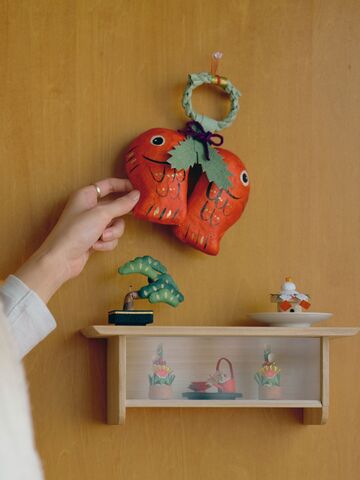 今年のオルネでは気軽に楽しめるお正月がテーマ。さっと飾れて目に入るたび嬉しい、ふくふくしい「向い鯛」の玄関飾りです。