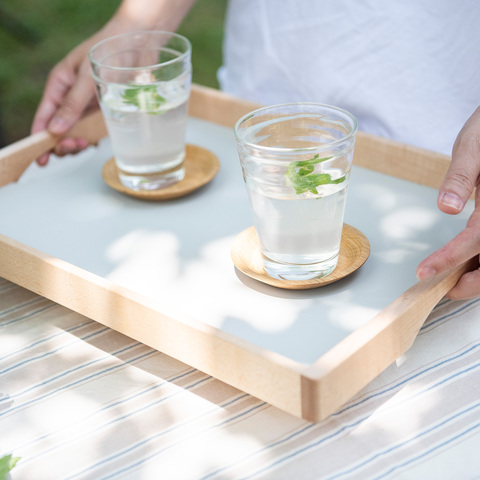 北海道産のナラ材とイタヤカエデ材にリノリウムの底板を組みわせた、北の住まい設計社オリジナルのトレイ。