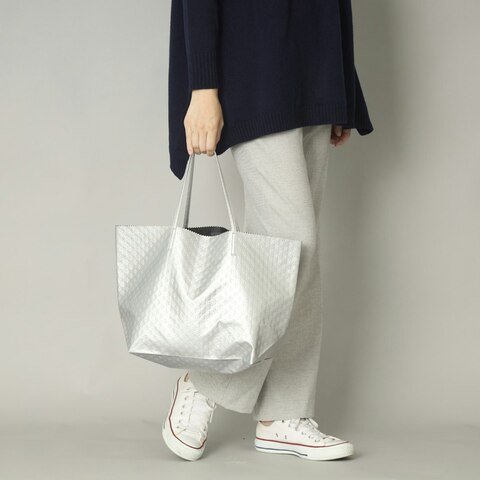 メタリックなカラーリングと質感から、レザーライクな見た目にも感じますが、素材はコットン生地にポリウレタンコーティングしたもの。横44.5cm、高さ27cmとA4サイズが入る大きさのトートで約80gと非常に軽量です。