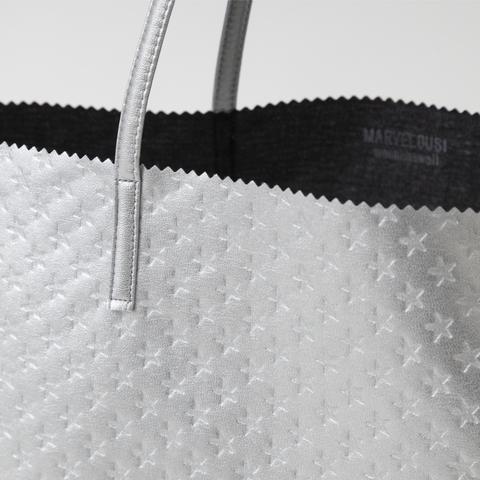 星の形をしっかり出すために裏地に芯を貼っているので、他のMARVELOUS!のバッグに比べて少しハリと厚みのある素材感。ホリデーシーズンの楽しい雰囲気を感じさせる、ゴールド、シルバー、ブラックをセレクトしました。