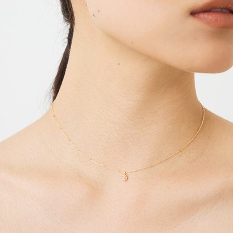 表情のあるパーツを等間隔で並べた36cmのチェーンは、肌そのものがきらめくように光り、デコルテをより美しく見せます。