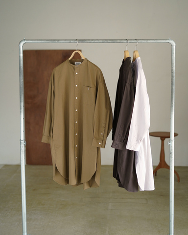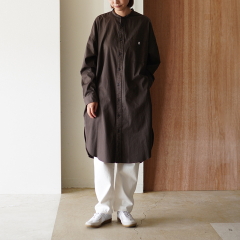 日常の装いをベースからアップデートしてくれるバンドカラーシャツワンピース。シンプルなシルエットながら、胸元のグリフィン刺繍やラウンドヘムが程よいメリハリを添えています。