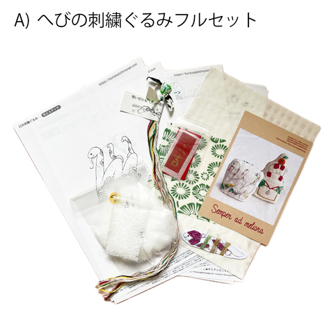A)布、図案と説明書、ワタ、ペレット、刺繍糸の"フルセット"