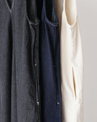 インナー次第で印象を変えられる、Vネックデザインが魅力のジャンパースカートです。顔まわりをすっきり見せる深めのVラインと、広めのアームホールで、レイヤードのアレンジがしやすい一着です。