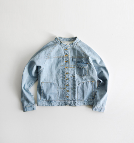 Si-Si-Si(スースースー)より、ブリーチ デニム バンドカラー ジャケット “BASIC DENIM JACKET”のご紹介です。