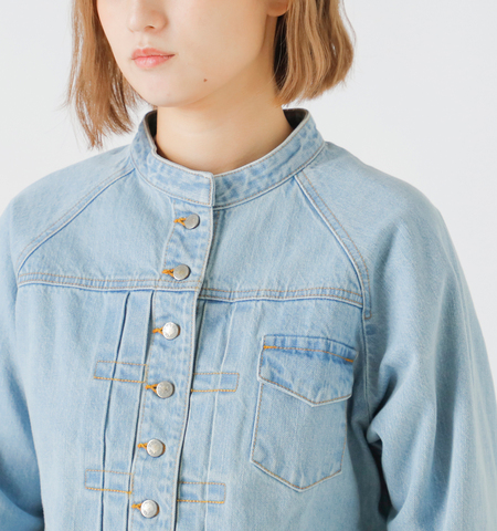 人気のデニムジャケットから、ブリーチ加工バージョンが登場です。ひと工夫加えられた珍しいバンドカラーで女性らしく、すっきりとした首元に。ブリーチ加工を施した上質なデニムが魅力です。