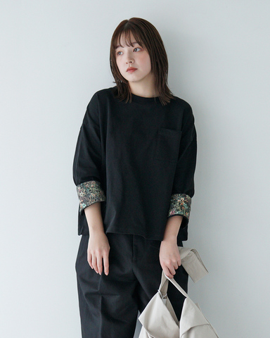 袖口を折り返すと現れるリバティ柄がアクセント。袖を下ろせばシンプルな無地Tシャツとしても着用でき、気分やシーンに合わせたアレンジが可能です。