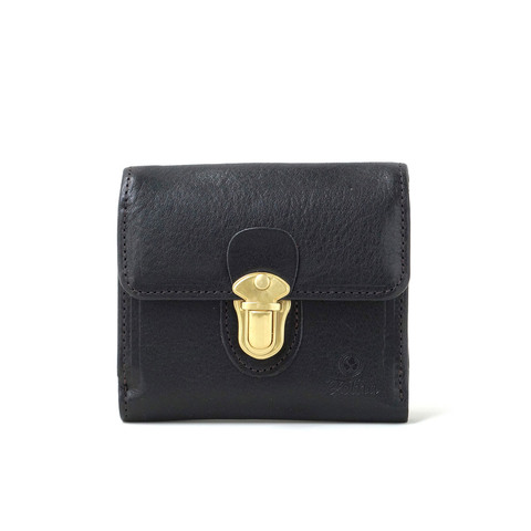 正面の差し込み金具がクラシカルなムード、金具は真鍮色で経年変化し深まるレザーの風合いを品よく引き立てます。