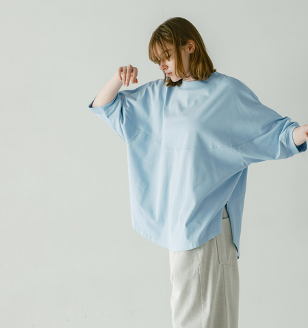 肩から円形に切り替えられたディテールが、丸みのある優しいシルエットを形成。肩周りに程よいゆとりを持たせ、袖の膨らみが全体のバランスを整えます。体のラインを拾いにくい構造で、動きやすさと美しさを両立したデザインです。