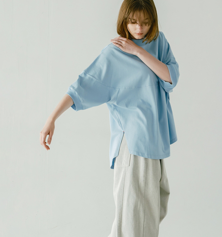 素材はコットンをベースに程よい厚みと柔らかさを併せ持ち、着るだけで安心感を与えるカットソー地を採用。しっかりとした肉感ながらも軽い着心地で、肌触りも優しく、一日中快適に過ごせます。透け感がないため、インナーの心配をすることなく幅広いコーディネートを楽しめます。