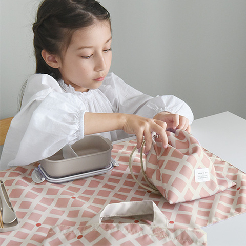 子ども用のコップやランチョンマットを入れるのにちょうど良い巾着袋。小ぶりなサイズ感で、ランドセルのフックに引っ掛けるのにも最適です。