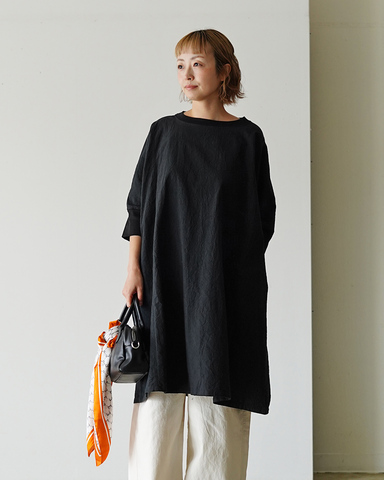 装いに迷う日も、さっと袖を通すだけで自然と整うチュニックワンピース。ハンドワッシャー加工による表情のある生地が、気負わない大人の雰囲気を演出します。