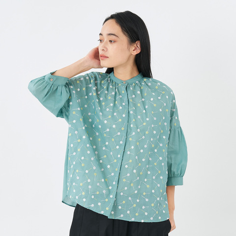 襟元や袖口に繊細なギャザーをたっぷりと寄せた、柔らかで女性らしい印象のブラウス。