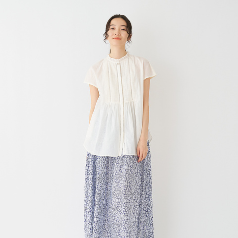 細やかなピンタックと繊細なレースを縦にあしらい、すっきりとした縦ラインを描く、クラシカルな雰囲気のブラウス。