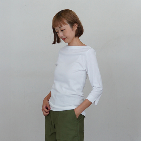 また、顔まわりをすっきり見せるボートネックが、ジャケットのインナーにも一枚着にも合わせやすいデザインです。春夏は軽やかに、秋は重ね着のベースとして、ロングシーズン着回しを楽しめる一枚です。