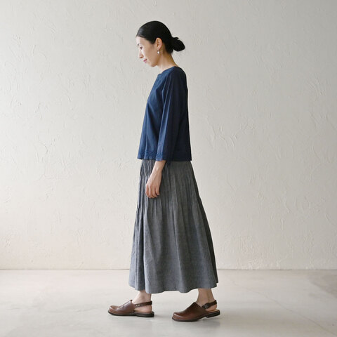 ピンタックがたっぷり入ったスカートと合わせて、お出かけスタイルに。