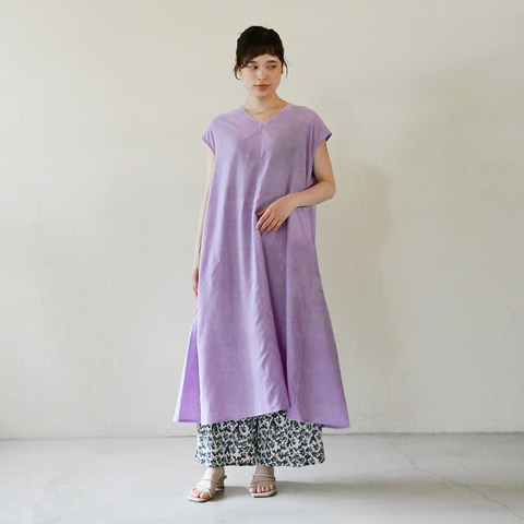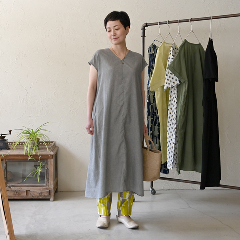裾にむかって緩やかに広がるシルエットと、顔回りをすっきりに見せてくれるVネックがポイント。