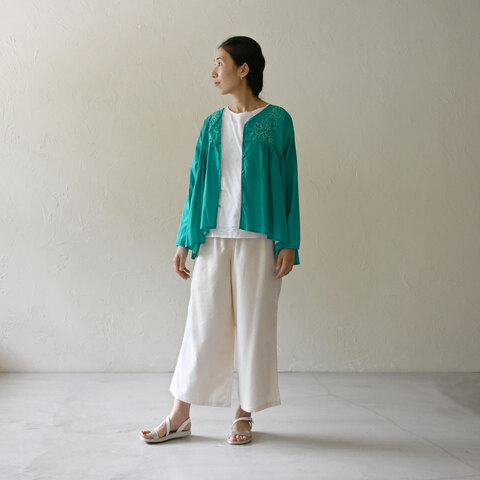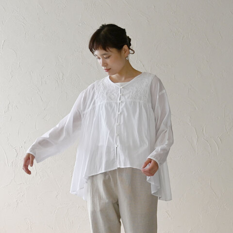 裾の広がりがなんともきれいなブラウスは、その名のとおり草花をたっぷりと胸に抱え込んでいるような刺繍デザインが魅力の一枚。