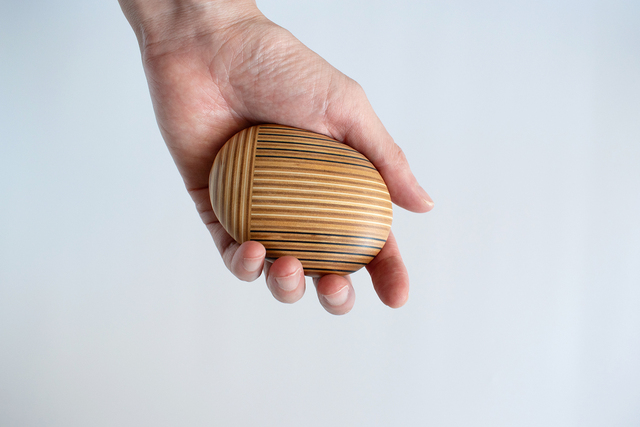 断面の美しさを楽しむ素材「Paper-Wood」をパッチワークのように繋ぎ合わせた、小石のような形状のペーパーウェイトです。