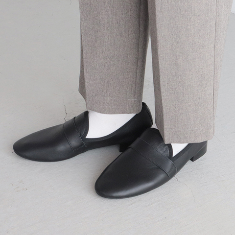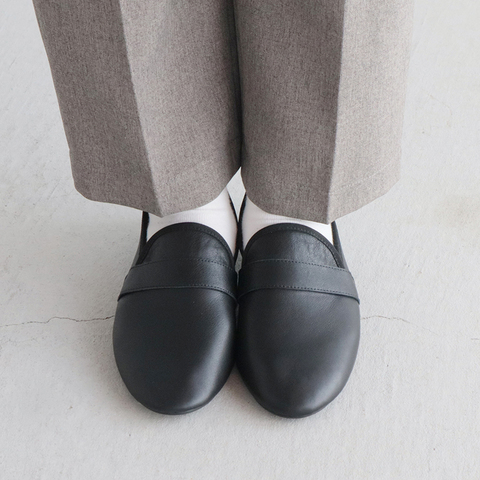 アッパーには柔らかなカーフレザーを使用し、しなやかなフィット感のある履き心地に。履き口にはグログランテープのパイピングが施すことで着脱しやすいようになっています。裏地にはキャンバス地を使用しており、サラリとした肌当たりです。