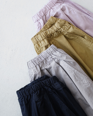 ウエストは総ゴム仕様にドローストリングを備え、長時間の着用でもストレスを感じにくい設計。製品染めならではのナチュラルな色合いが、シンプルなトップスとも相性良く、コーディネートに表情を添えます。