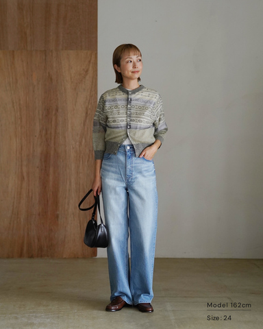 ワイドデニムの直線的なシルエットで、トップスの柄感をすっきり受け止めて。