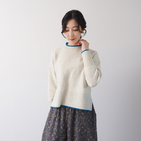 前後差やサイドのスリット、長めのリブが特徴の当店の定番コモドシルエットに首、袖口、裾にラインをあしらったこなれ感のある1着。シンプルながらもアクセントになり、どんなポトムスともスタイリングを楽しんでいただけますよ。
