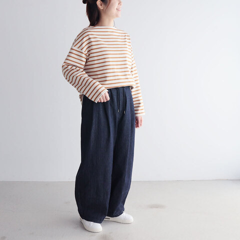 ウエッソンよりややゆとりをもたせたサイズ感は、年齢や性別を問わず大人の日常着として人気のアイテムです。デコルテがすっきりと綺麗に見えるボートネックは、アクセサリーやバンダナとも好相性。季節によっては薄手のハイネックを合わせても素敵ですね。左腕には、お馴染みのブランドタグがあしらわれています。